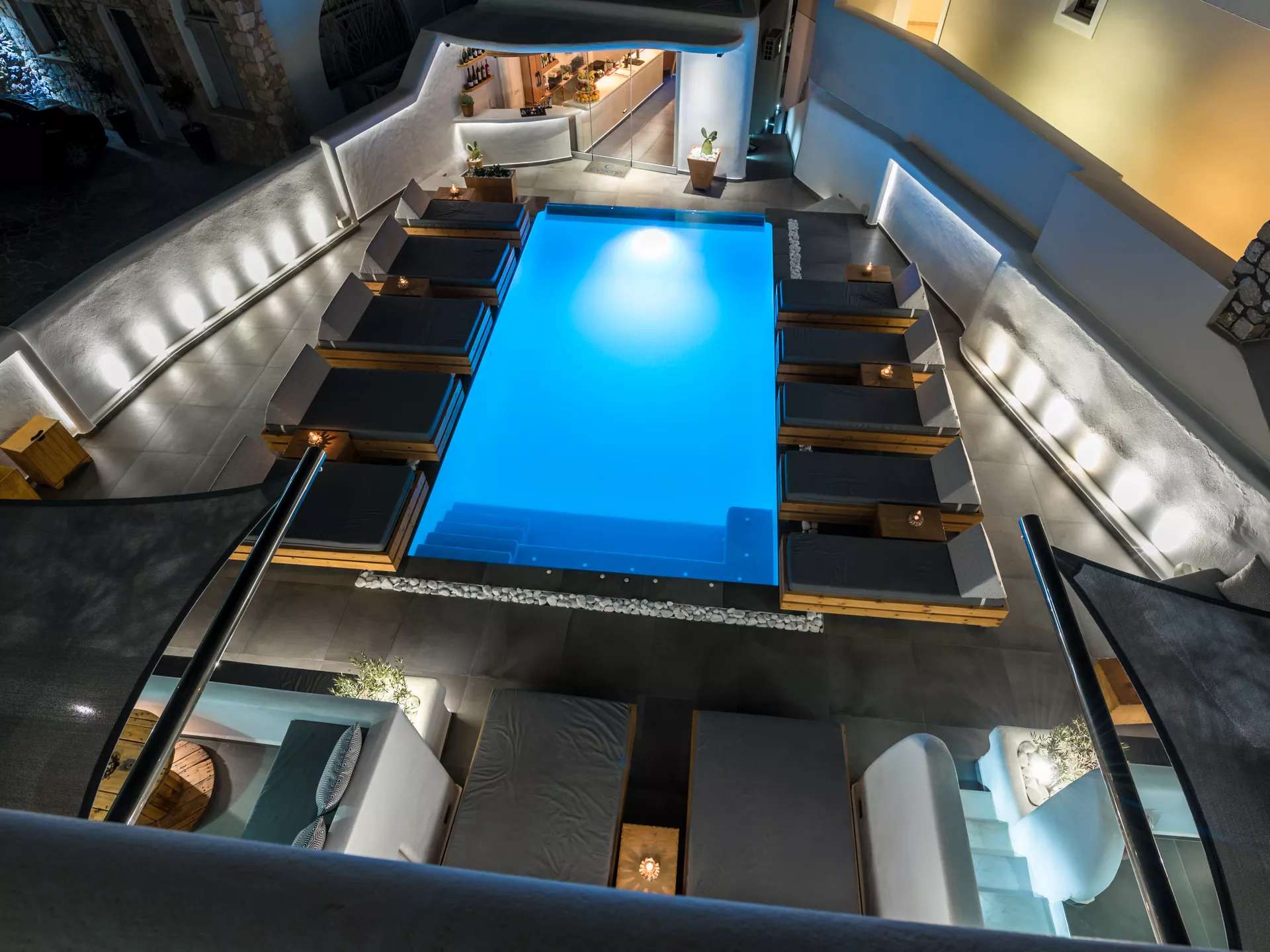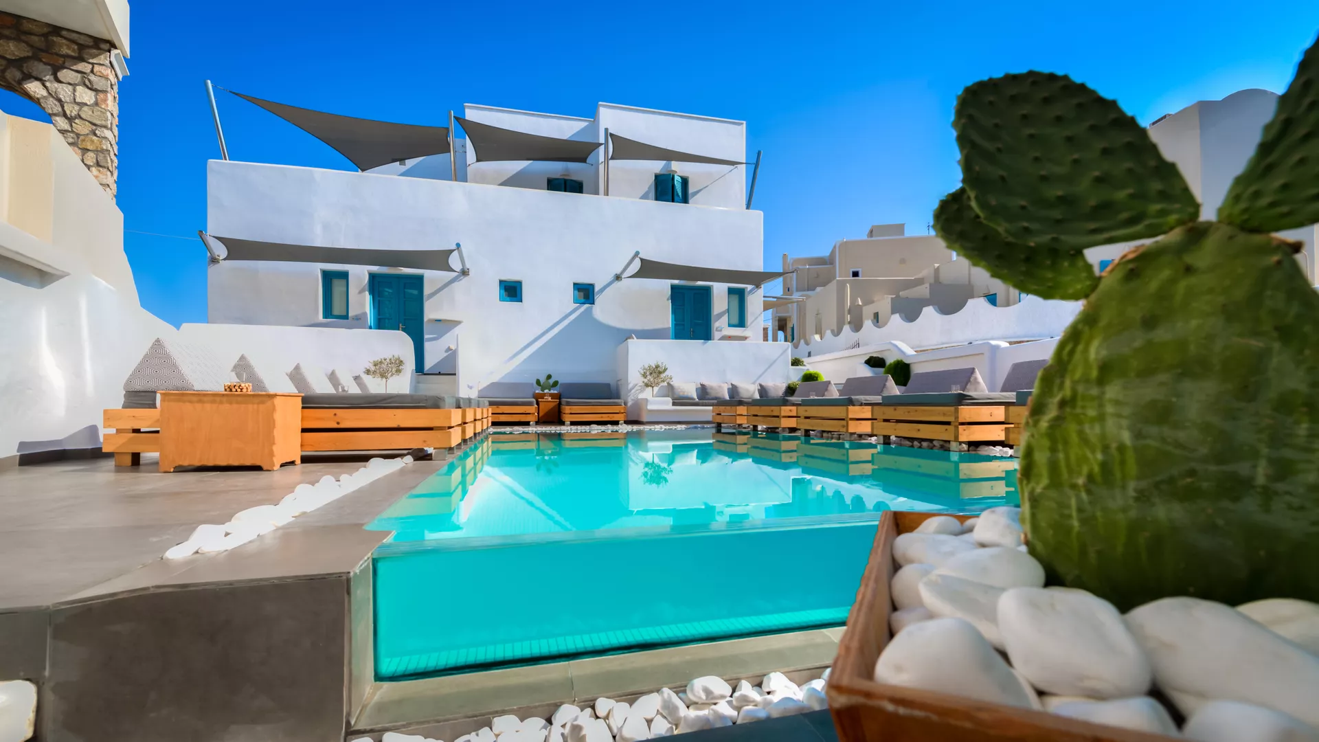 Welcome to the serene hospitality of Evgenia Suites, a member of Calm Collection Santorini. In a unique, serene location conveniently close to the center of Fira, Evgenia Suites harmoniously combines the best of both worlds; the privacy and tranquility of a quiet district with the bustling vibe of the island’s capital. Here, the lavishness of the Calm Collection Santorini meets the amiable, homely hospitality of Ms. Evgenia, her son George and her devoted staff, who aim to offer you a memorable stay in Evgenia Suites. Inviting accommodation with every modern amenity, welcoming outdoors made for lounging around the pool, homemade tastes and summery delights; this is the epitome of unforgettable holidays in Santorini. Staying at Evgenia Suites of Calm Collection Santorini is the ideal choice for those who seek to enjoy everything Santorini has to offer, from the unbeatable genuine atmosphere to the exciting allure of this superb destination.